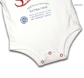Pure white one piece. Printed with the ingredients of a very fun shirt. Available in short sleeve one-piece designs. Comes with a great gifting can.
